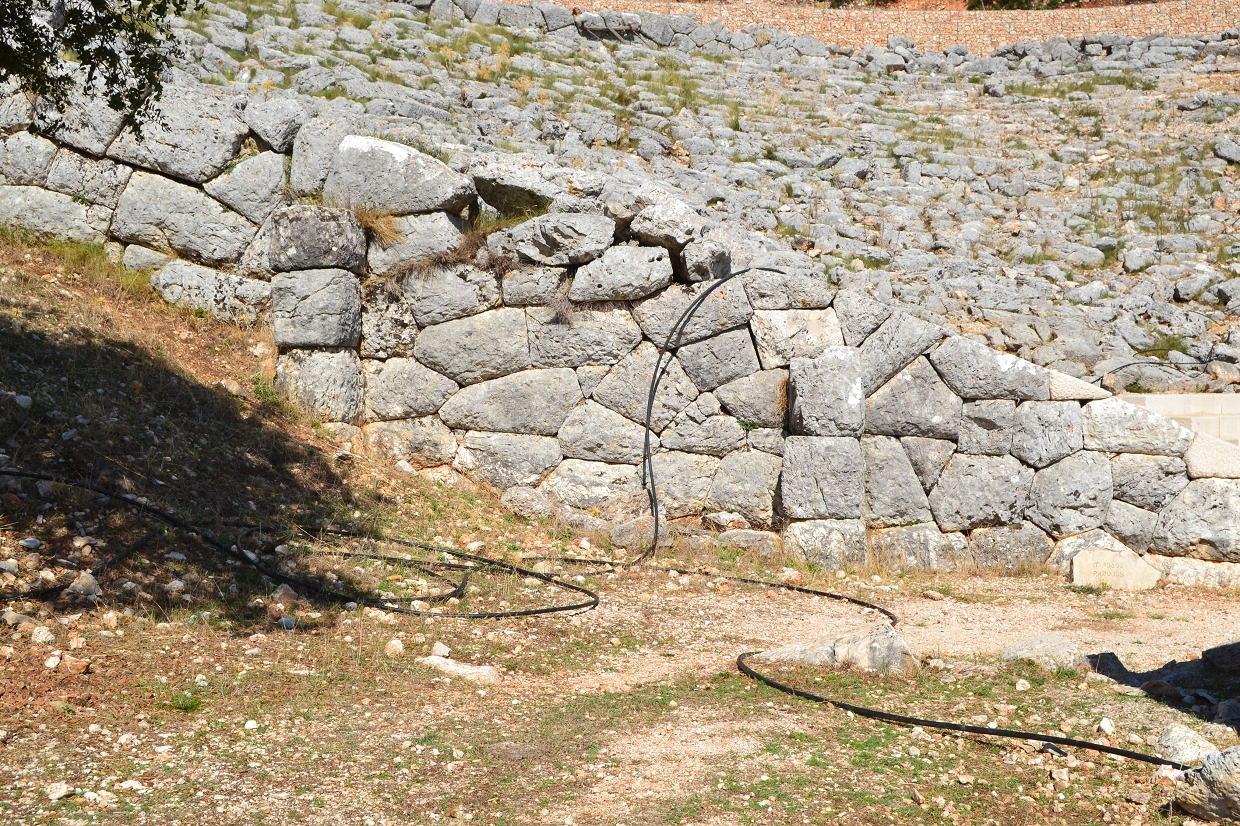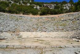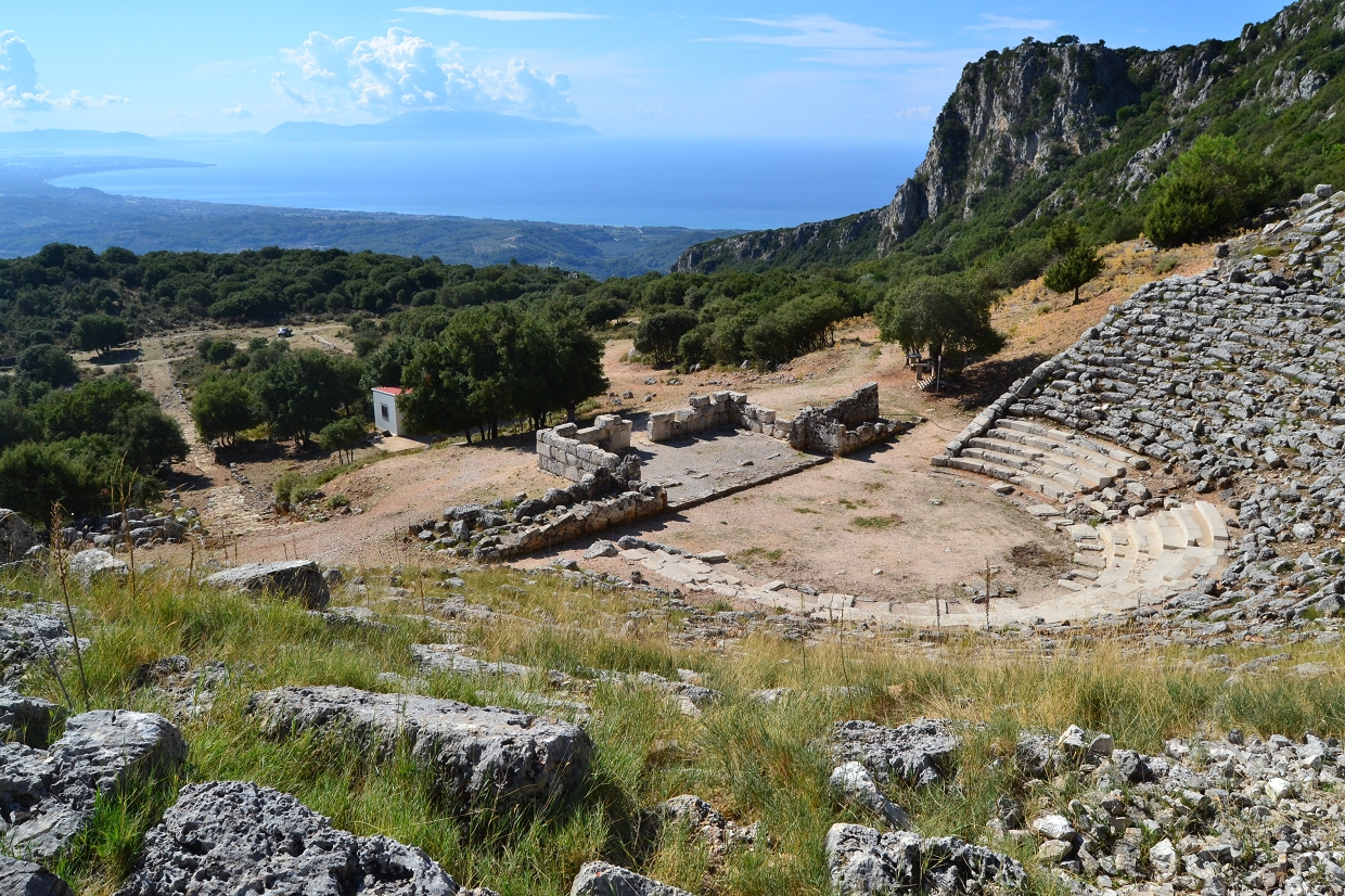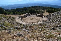 Die weniger als halbkreisförmig gebogene cavea wurde im 3. Jh. v. Chr. in einen natürlich anstehenden Felsabhang gebaut. Der Zuschauerraum ist durch ein Diazoma in zwei Ränge unterteilt, deren unterer aus 23 und deren oberer aus 11 Sitzreihen besteht. Neun Treppenaufgänge gliedern die cavea in 10 Kerkides. Die orchestra ist hufeisenförmig. Die erhöhte Bühne mit thyromata, d.h. Türöffungen, gilt als eine der ältesten ihrer Art. Ihre langrechteckigen seitlichen Grundmauern wurden unterschiedlich als Paraskenien oder als seitliche Rampen gedeutet. Ähnliche Rampen gab es in den Theatern von Korinth, Isthmia, Argos, Myrtasa,