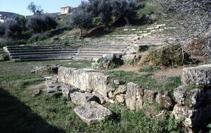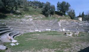 Das römische Theater lehnt an einem natürlichen Hang. Die cavea besaß mindestens 15 Sitzreihen. Von der scaenae frons sind nur die Grundmauern erhalten.