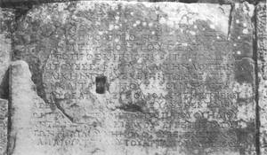 „Der ehrwürdige und den Kaiser liebende Prytane Hieron Aristogiton, Sohn des Hieron, Sohn des Hieron, baute dem Volk aus eigenen Mitteln das Gewölbe.”