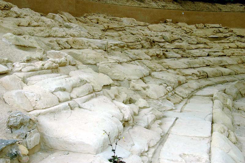 Der untere Teil der cavea ist gegen den Hang, der obere gegen eine Anschüttung gebaut. Der Zuschauerraum bildet einen über 180° hinaus gerade verlängerten Halbkreis. Die ima cavea besteht aus 10 Sitzreihen in 9 cunei. Die orchestra umgibt eine Sitzreihe mit Rückenlehnen, die Prohedrie. Vom Bühnengebäude blieben nur 10 Pfostenlöcher übrig. Der Bau des Theaters wird um 320 v.Chr. datiert.