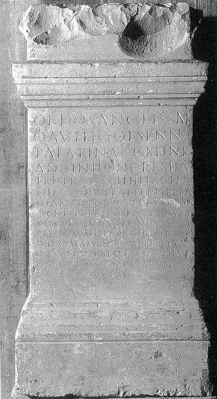 „ordo sanctissimus Q(uinto) Avilio Q(uinti) f(ilio) Sennio Palatina Cominiano in honorem patris eius Q(uinti) Avilii Hyacinthi quod is, praeter liberalitates spectaculorum quae sponte ededit vel postulata non negavit, velis novis sumptu suo in theatro positis cum suis armamentis, saepe pecunia mutua quae a magistratibus petebatur data actum publicum iuverit.“