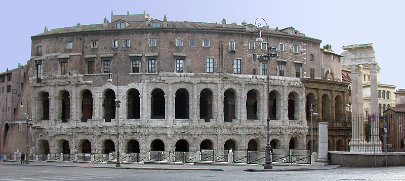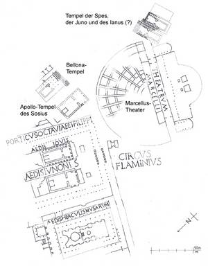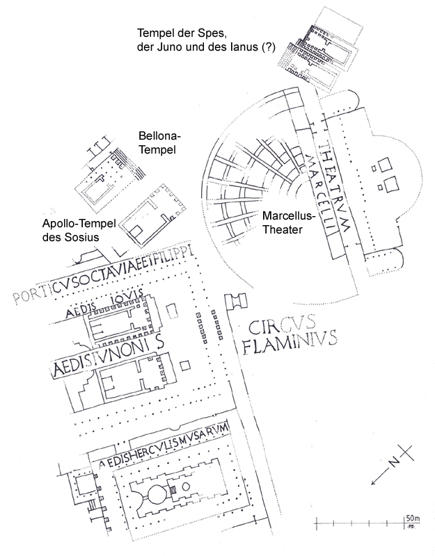 Apollo-Tempels des Sosius und man nimmt an, dass es die Stelle einnahm, wo seit 212 v. Chr. die Bühnenvorführungen der ludi Apollinares stattfanden: zunächst ohne ein eigenes Theater, dann in provisorischen hölzernen Bauten und schließlich eben im Steinbau des Cäsar bzw. Marcellus.