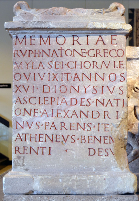 „Zum Andenken an Rufus. Er war Grieche von Geburt, aus Mylasa, Chorflötist. Er lebte 16 Jahre, sein Vater war Dionysius Asclepiades, nach Herkunft Alexandriner und Bürger von Athen, hat seinem Sohn, dem Wohlverdienten, aus eigenen Mitteln den Grabstein setzen lassen." (Übers. nach Linfert-Reich)