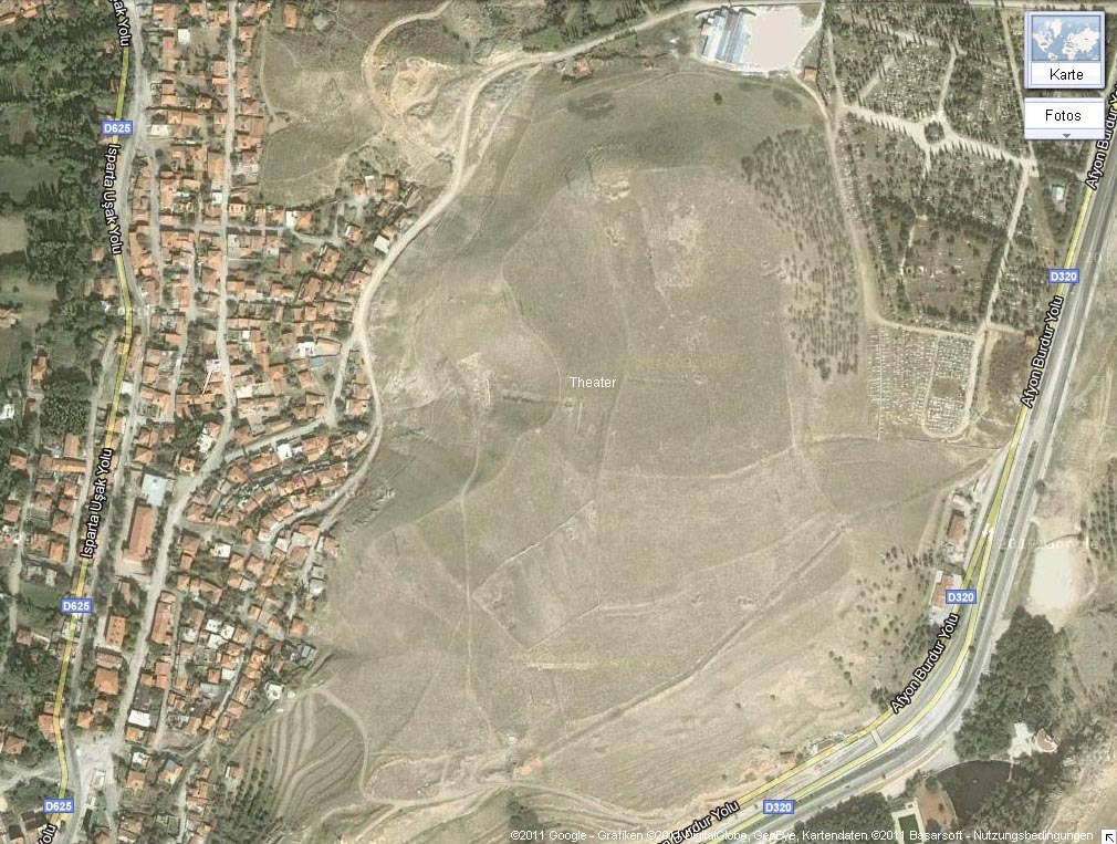 Der Bau war in den 1980er Jahren in einer Notgrabung durch das Museum von Afyon teilweise freigelegt und in einem kurzen Vorbericht publiziert worden (Topbaş 1993). Während die Sitzstufen der cavea bis auf Fundamente ausgeraubt zu sein scheinen, ist von den Grundmauern der Skene soviel erhalten, dass ihre Struktur erkennbar blieb. Die Fundamente der Skene sind in den Hang gebaut und aus mörtellosem Bruchsteinmauerwerk errichtet. Vor der Skene liegt, noch fast vollständig erhalten, das Plattenfundament des Proskenion. Triglyphenblöcke und Geisa aus gelblichem Kalkstein geben zusätzliche Aufschlüsse über den Aufbau des Proskenion: Es handelt sich um ein dorisch-ionisches Mischgebälk, das von seinen Architekturformen her in den späteren Hellenismus zu weisen ist.
