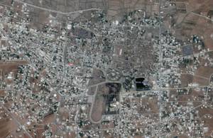 Bosra, Luftbild mit Lageangabe von Theater, Amphitheater und Hippodrom (Bild: google-earth).