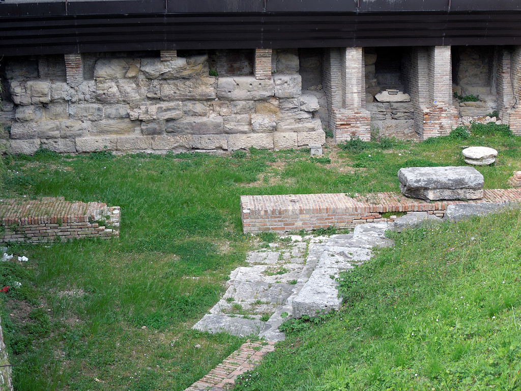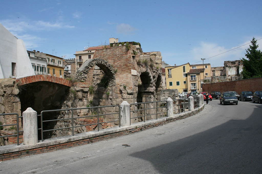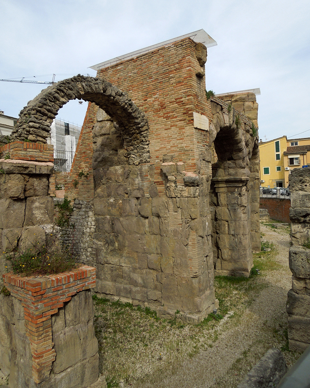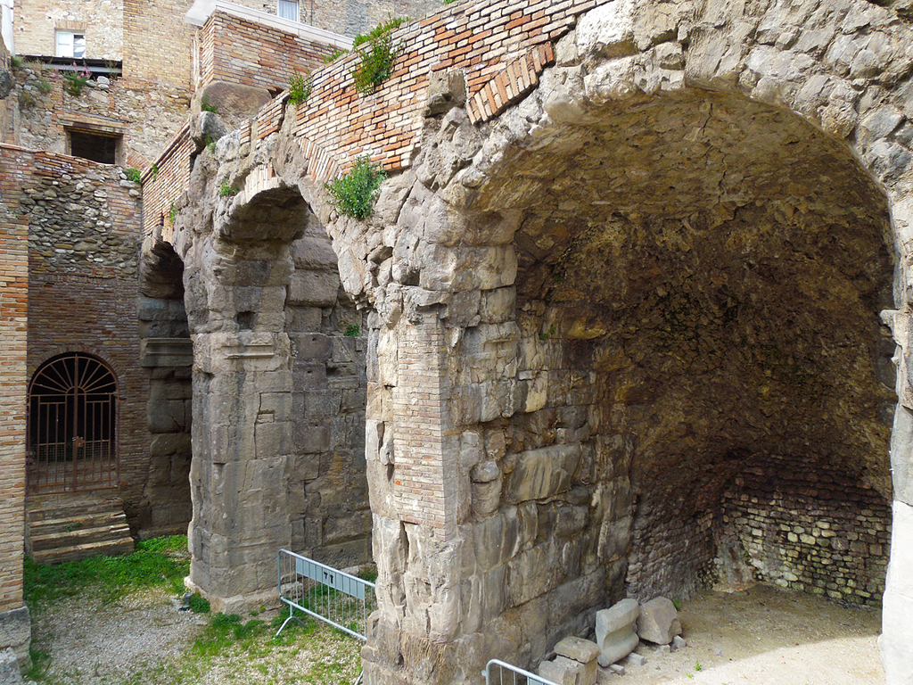 Amphitheater. Aufgrund der modernen Überbauung ist das Theater nur teilweise ausgegraben. Seine Erbauung wird einerseits nach der reichen Architekturdekoration in frühaugusteische Zeit datiert, andererseits werden große Teile des Mauerwerks einer Erneuerung wohl trajanischer Zeit zugeordnet.
