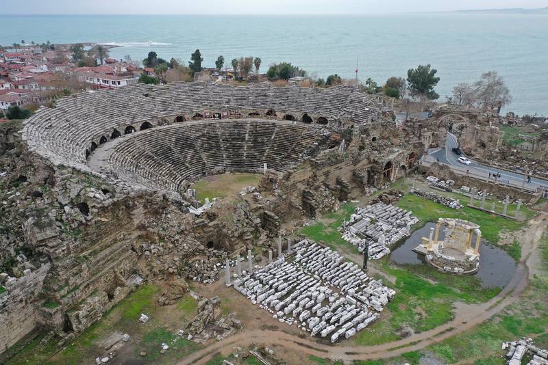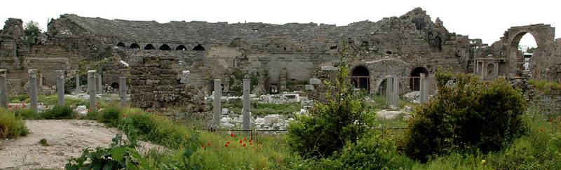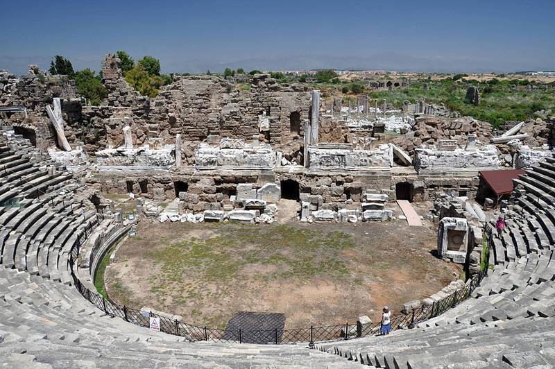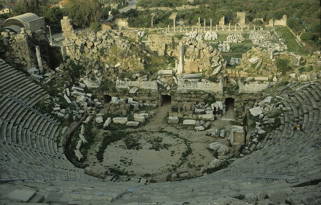 Das römisch-kleinasiatische Theater stammt aus der Mitte des 2. Jhs. n. Chr., im 3. Jh. baute man es für Arenaveranstaltungen um. Von einem immer wieder postuliertem hellenistischem Vorgängerbau ist nicht bekannt.