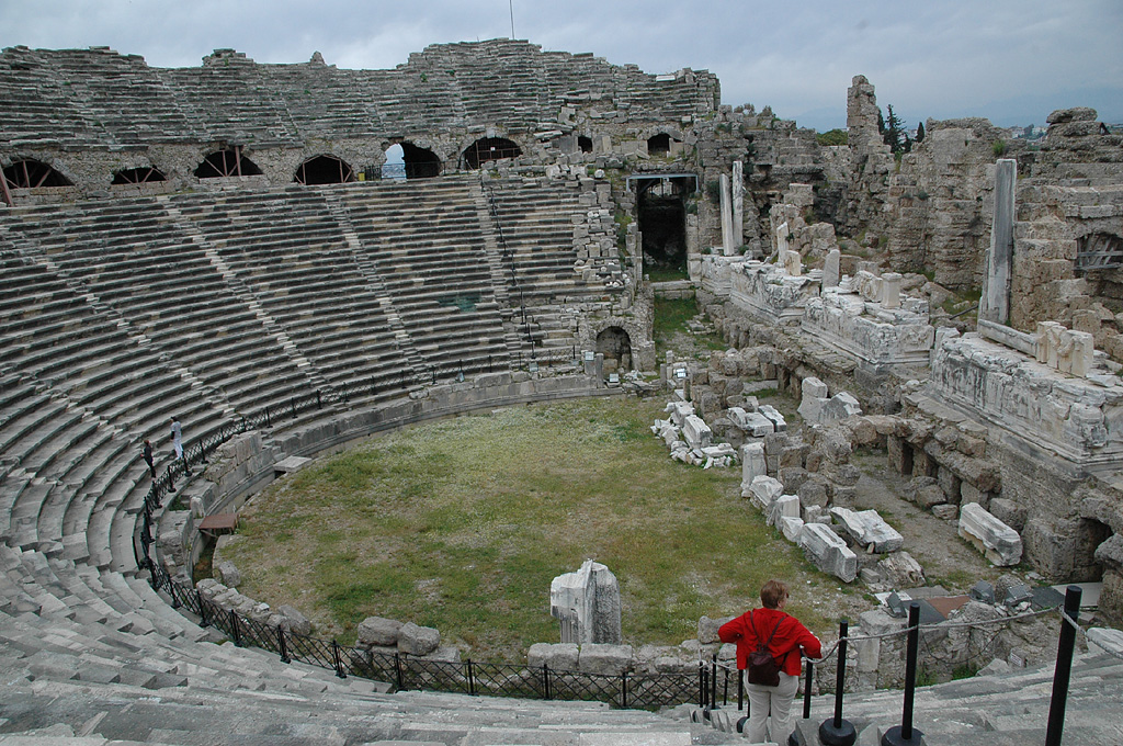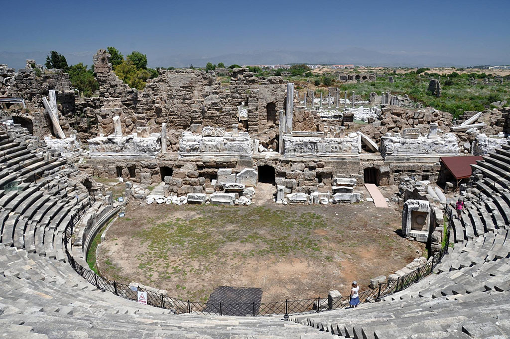 Die Stadt Side liegt in ebenem Gelände, lediglich an der Stelle des Zuschauerraumes vom Theater gab es eine leichte Erhöhung, gegen die man den unteren Zuschauerraum baute. Die höher gelegenen Teile ruhen auf Substruktionen: die Flügel und die summa cavea des Zuschauerraums auf gewölbten Radialkammern und einem ringförmigen Korridor, von wo aus man den oberen der beiden Ränge betreten konnte. Auf dem obersten Umgang steht eine Reihe von Bänken mit Rückenlehnen.