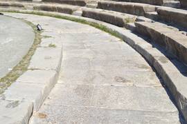Das griechische Theater wird unterschiedlich in die 1. Hälfte des 3. Jhs. oder das späte 2. Jh. v. Chr. datiert. Hinter seiner erhöhten Bühne soll sich bereits im 2. Jh. v. Chr. eine 2-stöckige Bühnenfassade erhoben haben. In römischer Zeit fanden im Bereich des Bühnengebäudes Umbauten statt. In den unteren Teilen ist die cavea vollständig in den Fels geschlagen.