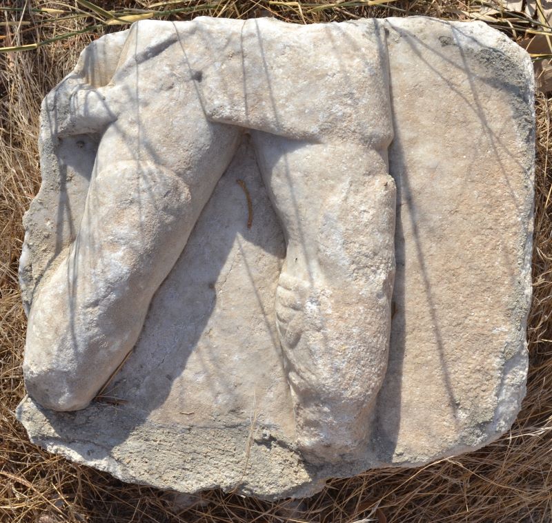 Das Relief war in der Festung von Bodrum vermauert und zeigt die Beinpartie eines Gladiators.