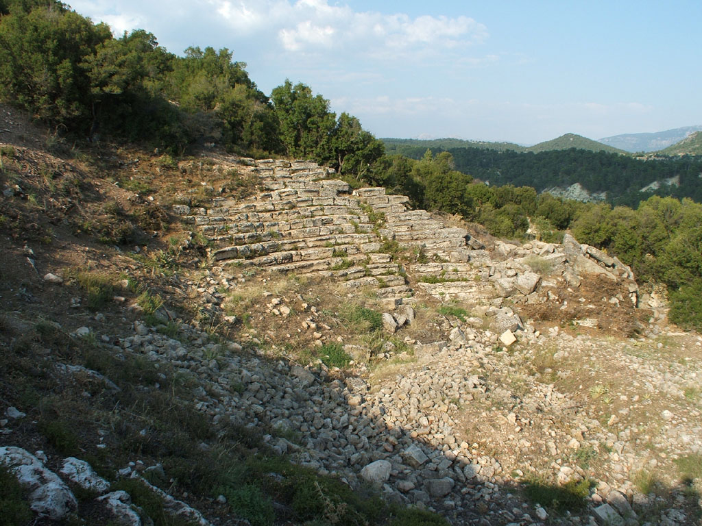 Es handelt sich um ein griechisches Theater mit einer den halbkreis überschreitenden cavea, die an einen natürlichen Hang gebaut ist. Von ihr haben sich einige Sitzreihen erhalten, gegenüber den 20 von Spratt und Forbes erwähnten sind heute noch 18 erkennbar. Das Koilon war durch 3 Treppen, von denen heute noch die beiden äußeren erhalten sind, in 4 Kerkides unterteilt. Das Bühnengebäude ist vollständig verschüttet.