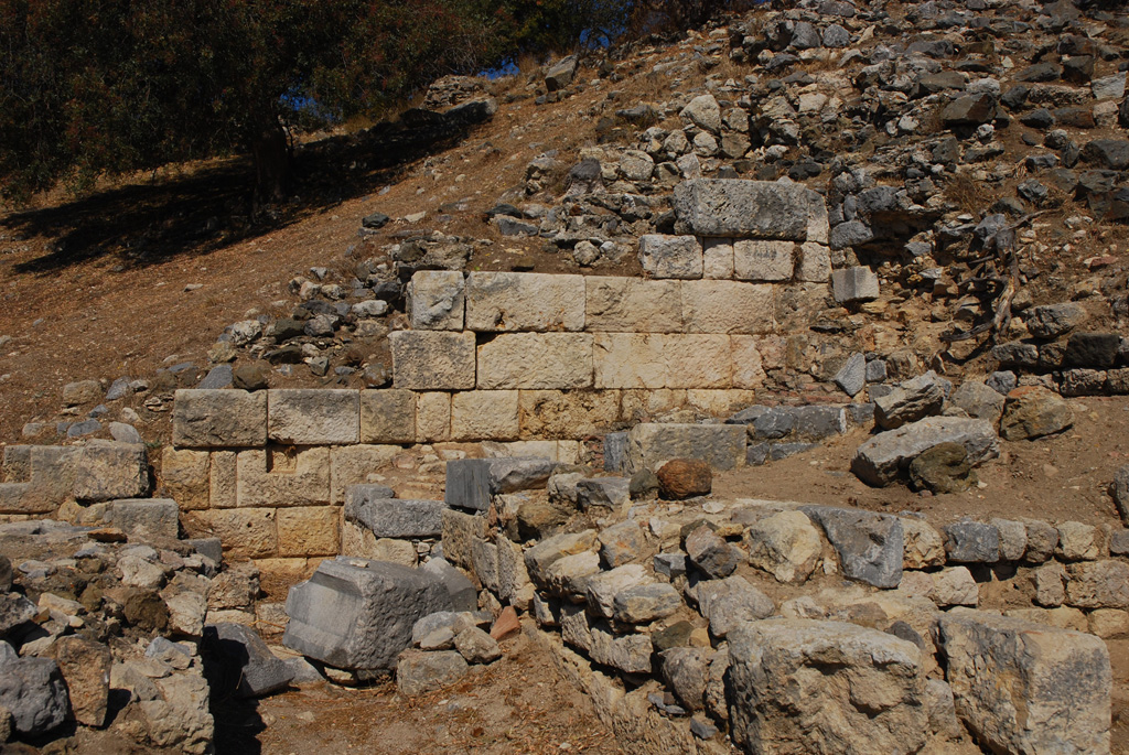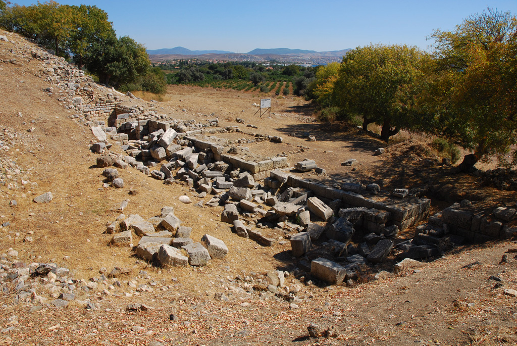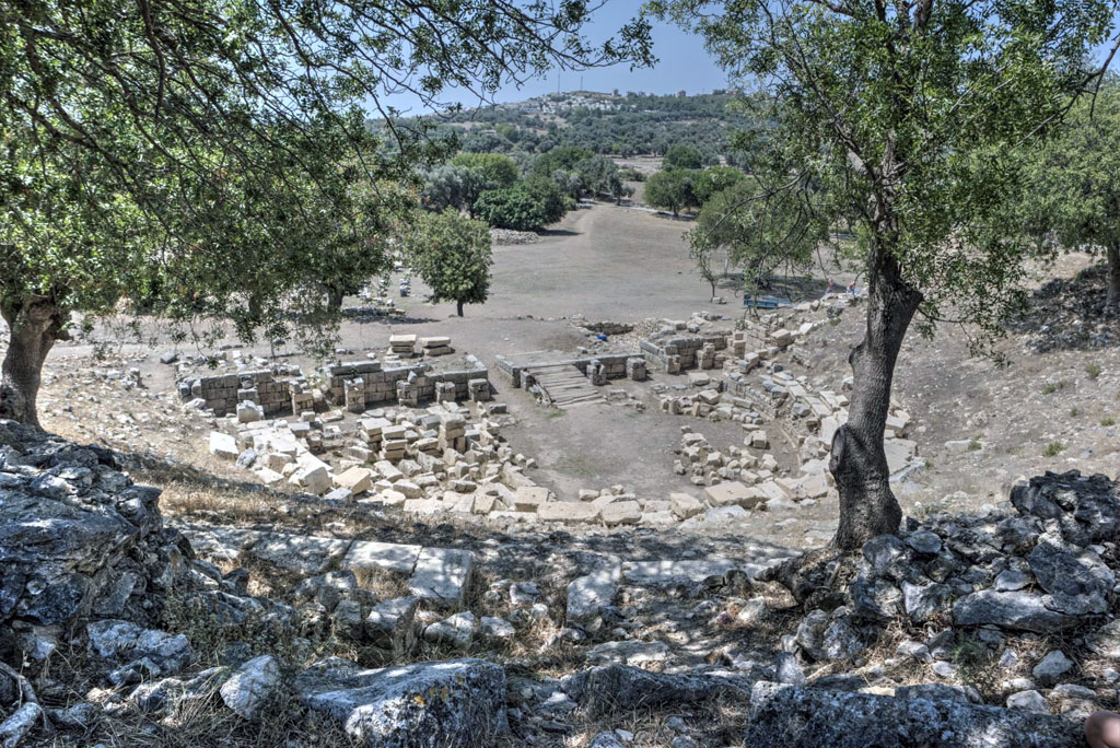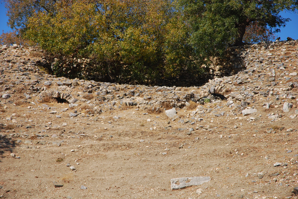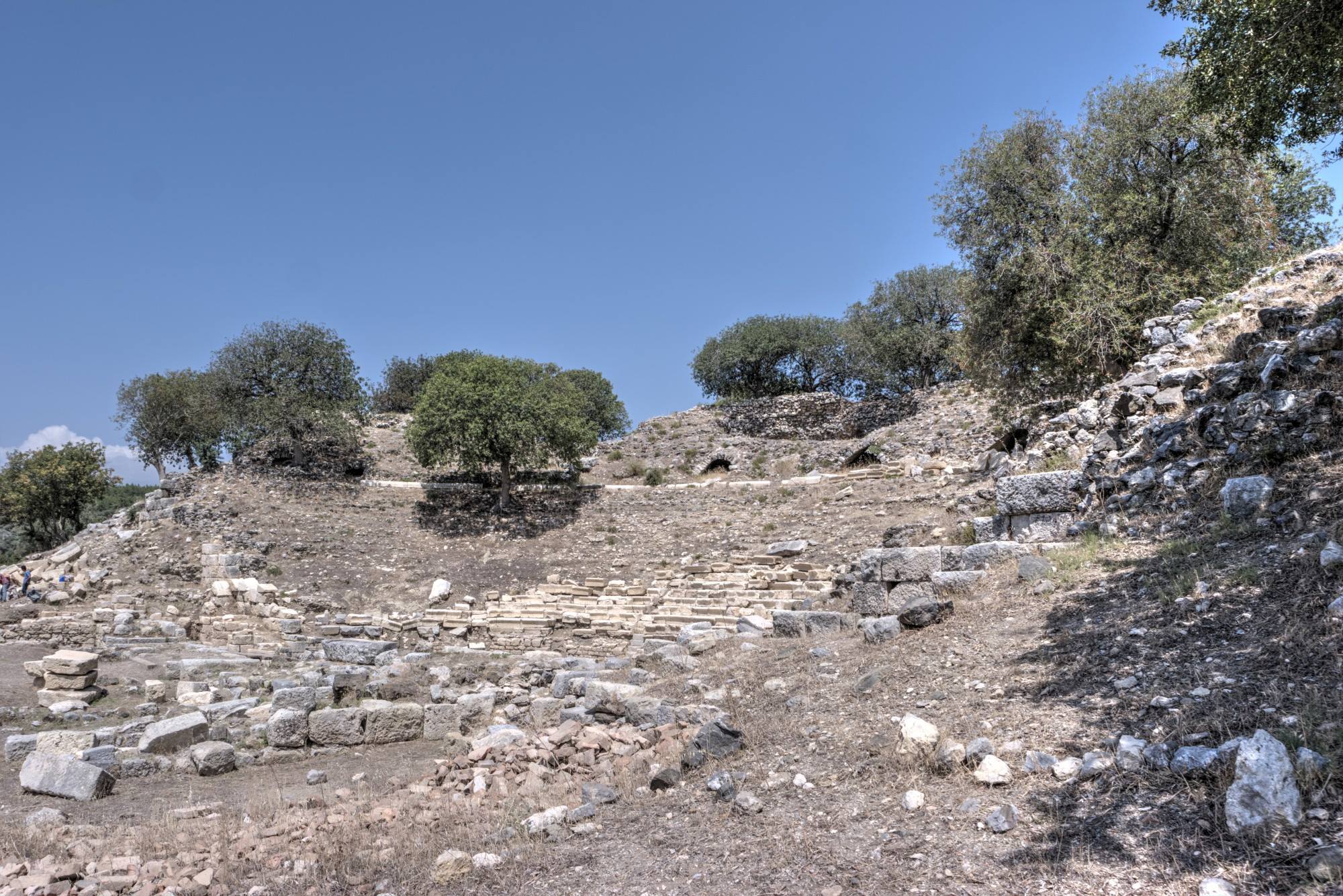 Das am Hang der Akropolis gelegene große Theater wurde von Béquignon/Laumonier hellenistisch datiert. Bei den neuen Untersuchungen unter der Leitung von N. Tuna von der Middle East University wurde dies dahingehend differenziert, dass der Kern des Theaters samt Bühnengebäude wohl hellenistisch ist, in der römischen Kaiserzeit jedoch Ausbauten der Cavea vorgenommen wurden wie auch der Skene. Letztere Maßnahmen werden nach der Ornamentik der Bauglieder der Zeit unter Kaiser
