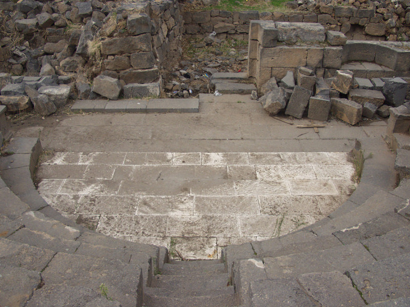 Vom wahrscheinlich römischen Bau sind erst seit jüngerer Zeit gut erhaltene Reste der cavea sichtbar geworden. Aufgrund der geringen Dimension handelt es sich eher um ein Bouleuterion, Odeion oder kleines Kulttheater.