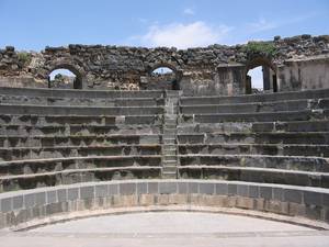 Philippus Arabs (244-249 n. Chr.), des ersten Kaisers arabischer Abstammung auf dem römischen Thron. Er stammte aus aus diesem Ort und so wird in der modernen Forschung auf ihn der Ausbau der Stadt nach römischem Muster zurückgeführt. Das kleine Theater liegt an einem nur seichten Hang, so dass ein Teil der cavea mit überwölbten Substruktionen versehen werden musste. Bühnengebäude und Zuschauerraum bilden eine Einheit. Die cavea besteht aus einem einzigen Rang mit 9 Sitzstufen, darüber verläuft ein Umgang.