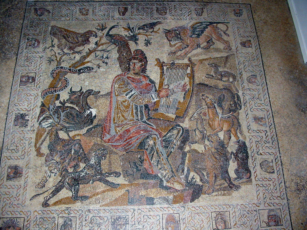 Rottweil. Bei dem syrischen Mosaik sind alle antiquarischen Details außergewöhnlich reich angegeben, der Fall seines Mantels von der Schulter über den Rücken und die Oberschenkel, seine hochgegürtete Tunika, die Stoffapplikationen auf seinen Ärmeln, seine Beinkleider und seine Schuhe. Die Kithara ist mit exorbitanten 16 Saiten ausgestattet, an ihren Jocharmen sieht man Löwenprotome. Das Bild aus dem Hauran zeigt den Orpheus in einer ungewöhnlich wilden Felslandschaft, umgeben von einer besonders vielfältigen Schar unterschiedlichster Tiere. Der Vogelgreif, das Tier Apollons, berührt mit seinen Vorderpranken fast die Kithara: Die unterschiedlichen antiken Überlieferungen weisen teilweise Apollon und teilweise Orpheus als Erfinder der Kithara aus, freilich nur der 7-saitigen. Einige Schriftsteller der römischen Zeit wußten, dass es Orpheus war, der ihre Zahl auf 9 erhöhte - eine Zahlenkonstruktion, die eine Beziehung zu den 9 Musen herstellen sollte, denn Kalliope galt vielen als die Mutter des Orpheus. Nach verbreiteterer Überlieferung war es jedoch der Musiker Phrynis, der ihre Zahl auf 9 erhöhte, sein Kollege Timotheos erweiterte sie auf 12 und ganz allgemein häufen sich in der römischen Kaiserzeit die Klagen darüber, dass die traditionellen Instrumente immer aufwändiger gestaltet würden, wofür die 16 Saiten der Kithara auf diesem Mosaikbild ein beeindruckendes Beispiel geben.